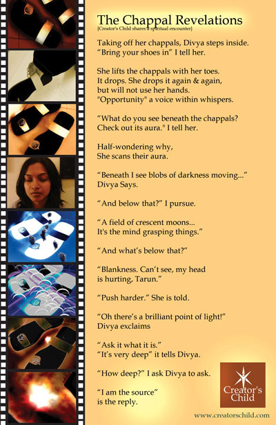 This is the 27th issue of Tickle, a newsletter from Creators Child. A special welcome to new Tickle readers. And a special thank you to our old readers and contributors. This issue is heavier. Dealing with heavy issues. We start with The Chappal revelations, a reminder that within the humblest stone is a magnificent gift. This e-poster is also included in Send-a-thought section in our website. We then share a magical dance with the rider, many of us like Bilva have spotted the cosmic, but are we talking about it, are we letting it be part of our lives? We then select the best from our blog, www.creatorschildspeaks.blogspot.com a luminous deep end revelation about The Aura of God. We then address a serious issue in The Metamorphosis: This deals with the dark night of the soul or the price tag of God. We We close with a beautiful thank you from Chaitra who accuses us of being responsible for her happiness.